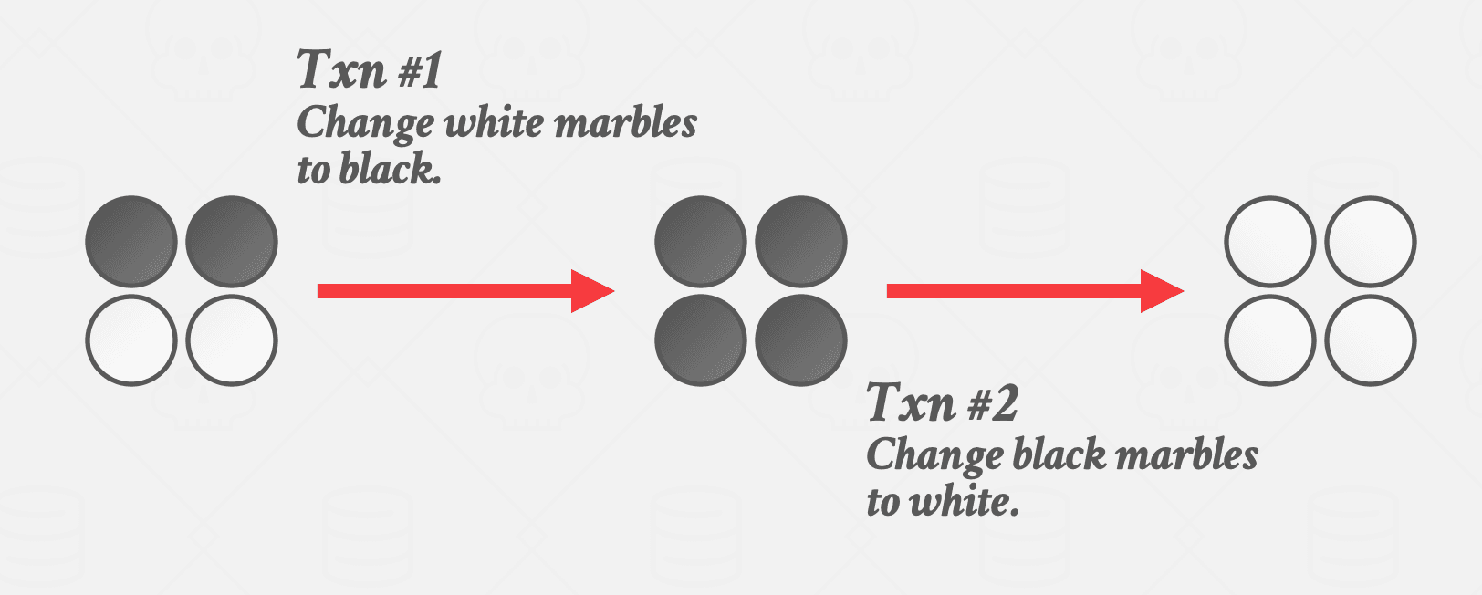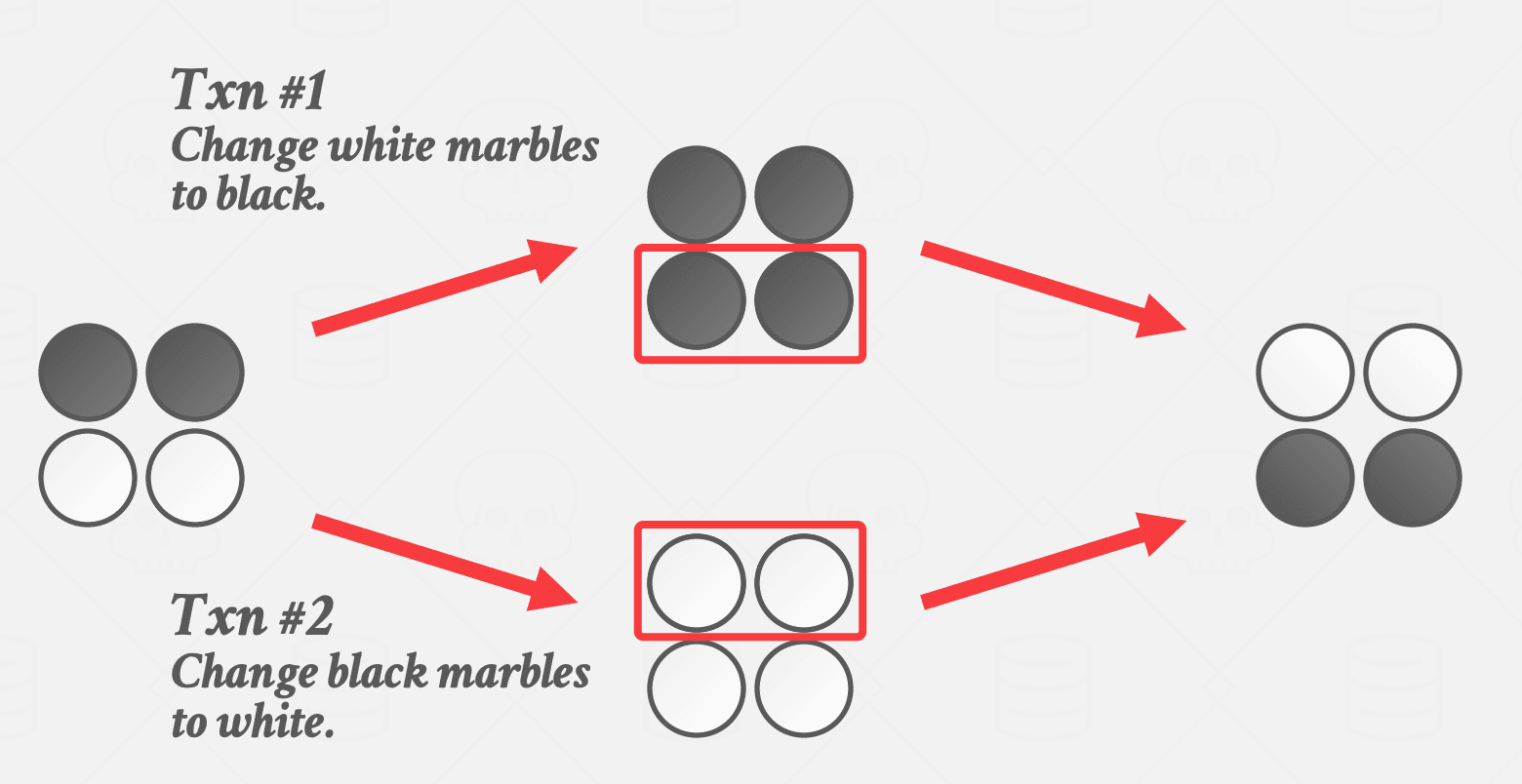 当两个并发事务修改不同的对象时,可能会发生写入偏差异常,从而导致不可序列化的计划。例如,如果一个事务将所有白色弹珠更改为黑色,而另一个事务将所有黑色弹珠更改为白色,则结果可能与任何可序列化计划不对应。