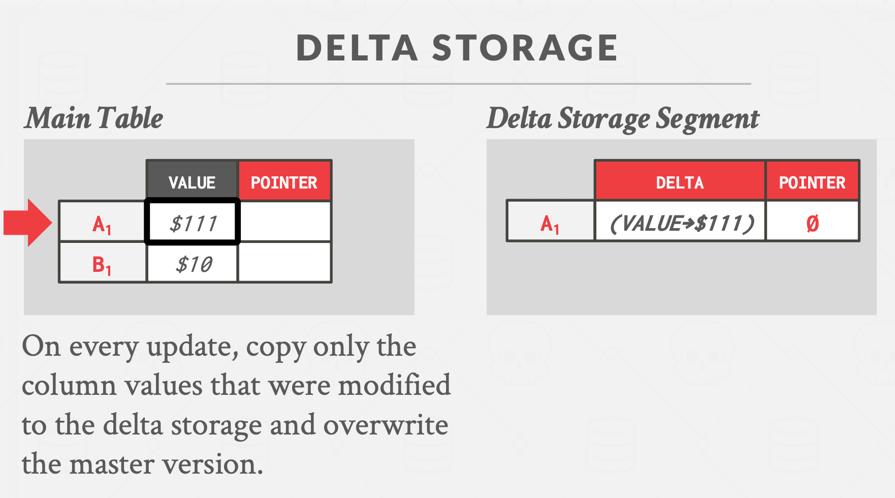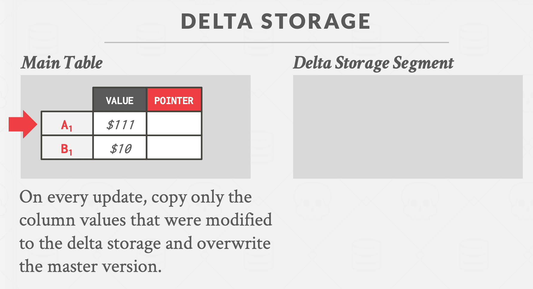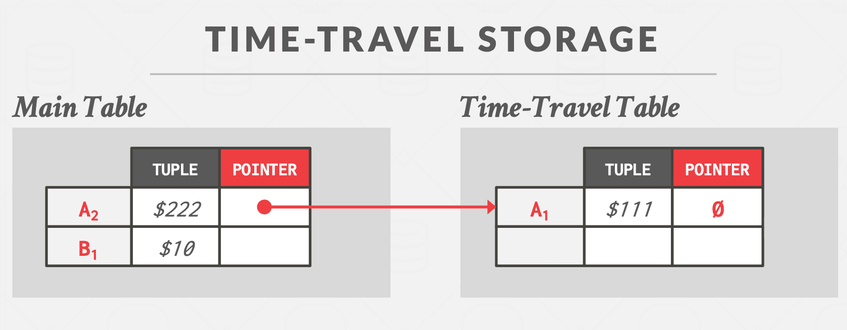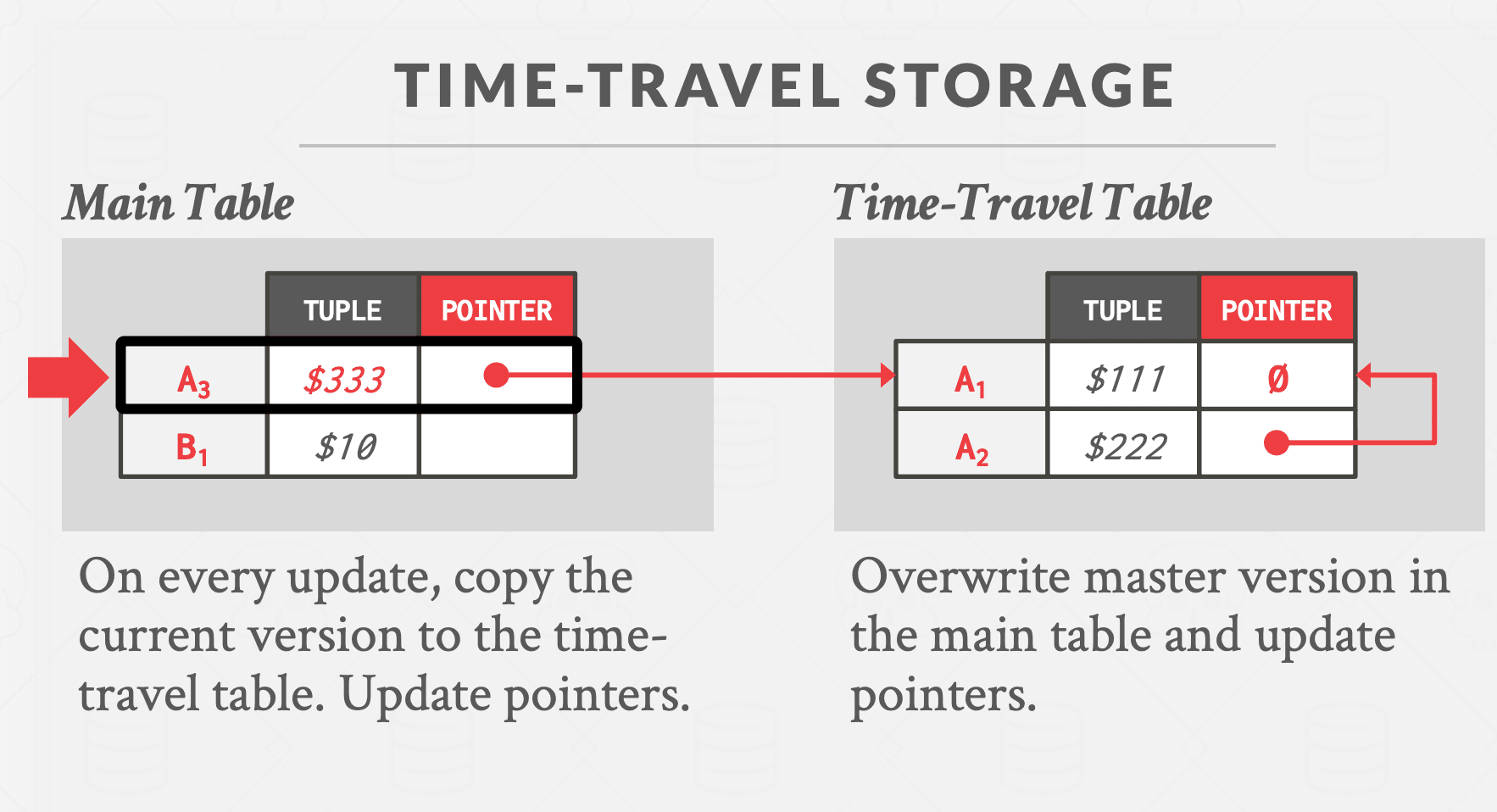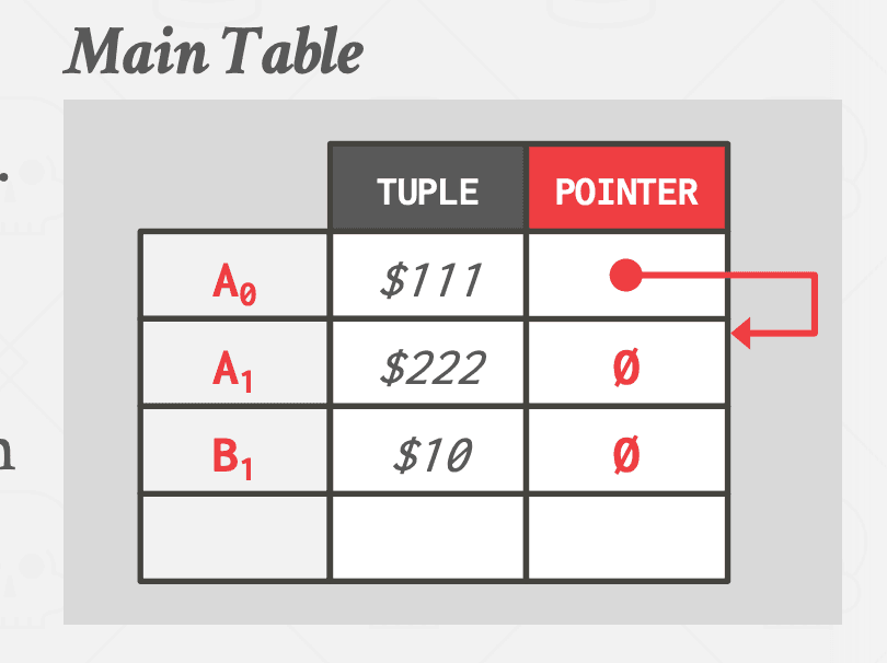 方法 #2:时间旅行存储 DBMS 维护一个单独的表,称为时间旅行表,用于存储旧版本的元组。每次更新时,DBMS 都会将旧版本的元组复制到时间旅行表中,并使用新数据覆盖主表中的元组。主表中的元组指针指向时间旅行表中的过去版本。