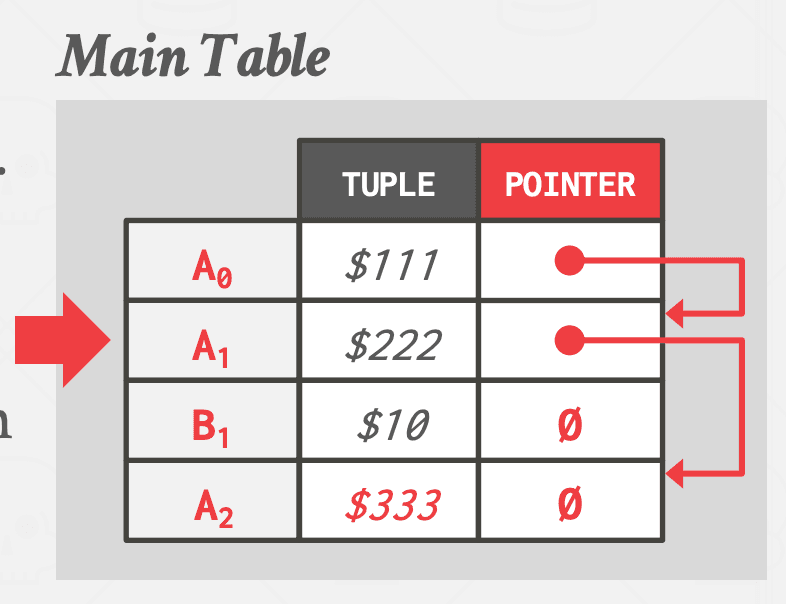这是 DBMS 存储逻辑对象的不同物理版本的方式,以及事务如何找到它们可见的最新版本。