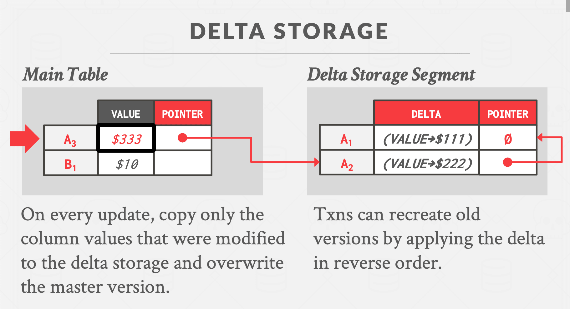 方法 #3:增量存储 与时间旅行存储类似,但 DBMS 只存储增量,或元组之间的变化,而不是整个过去的元组,即所谓的增量存储段。然后,事务可以通过以相反的顺序循环访问增量并应用它们来重新创建旧版本。这导致写入速度比时间旅行存储更快,但读取速度更慢。