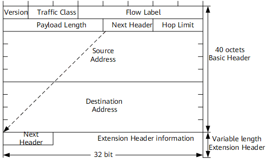 固定首部 40 字节,相比 IPv4 去除校验和,并且不允许在传送过程中进行分片(只能由通信两端分片)。payload 指明拓展首部与数据内容的总长度,最大为 64KB。首部长度必须为 8B 整数倍。