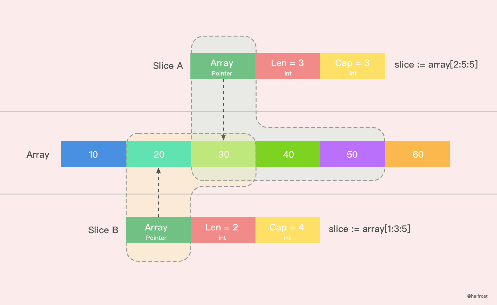 值得注意的是,Golang 的 Slice 扩容并不意味着底层 Array 的扩容,比如下图 B 进行扩容,可能只是涵盖[20,30,40,50]这个部分。这里讨论的是底层 Array 的扩容,但是机制是类似的。