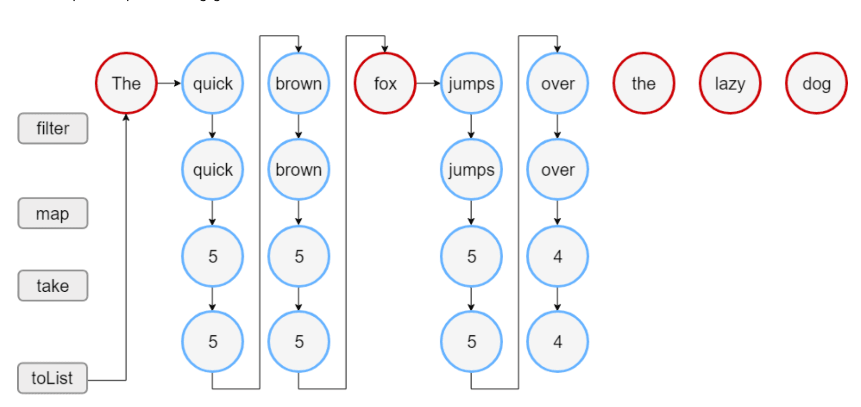 但是这样的操作会导致多个链式调用,进行多次重复迭代,比如下面的代码,所有结果都是立即计算的,进行了两遍集合的迭代。