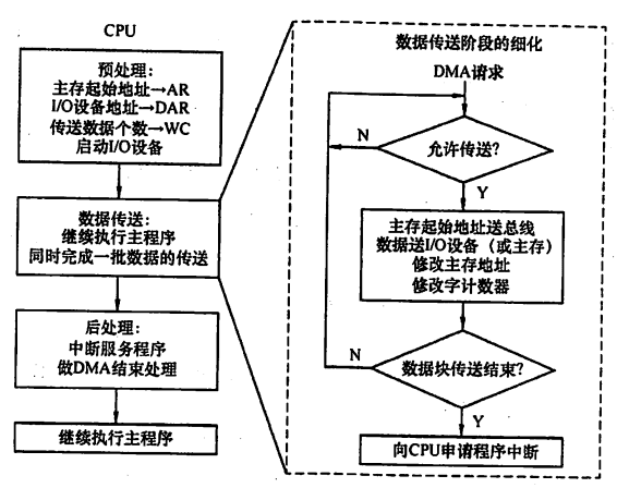 主存 DMA 直连,CPU 发布读写任务,DMA 执行,执行完成中断通知 CPU。