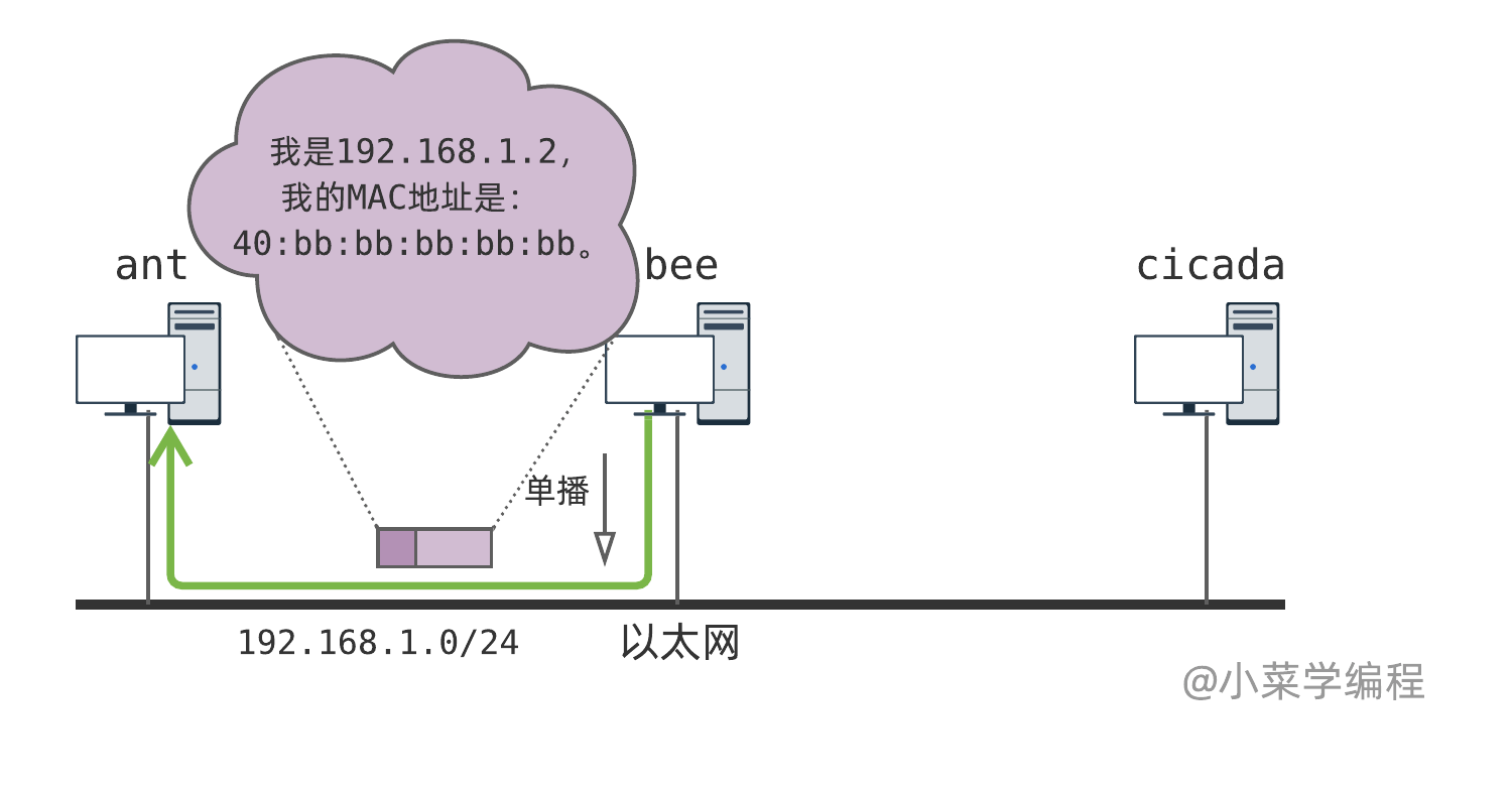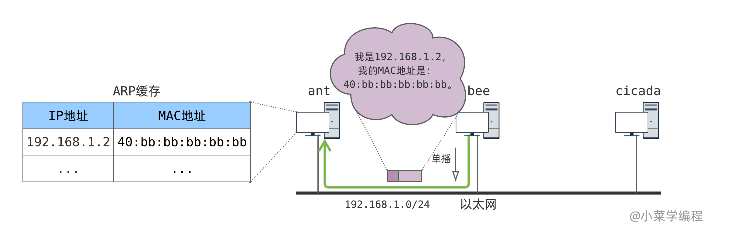 - 当两者相同时,将 ARP 请求报文中的源 IP 地址和源 MAC 地址存入自己的 ARP 表中。之后以单播方式发送 ARP 应答报文给 A。