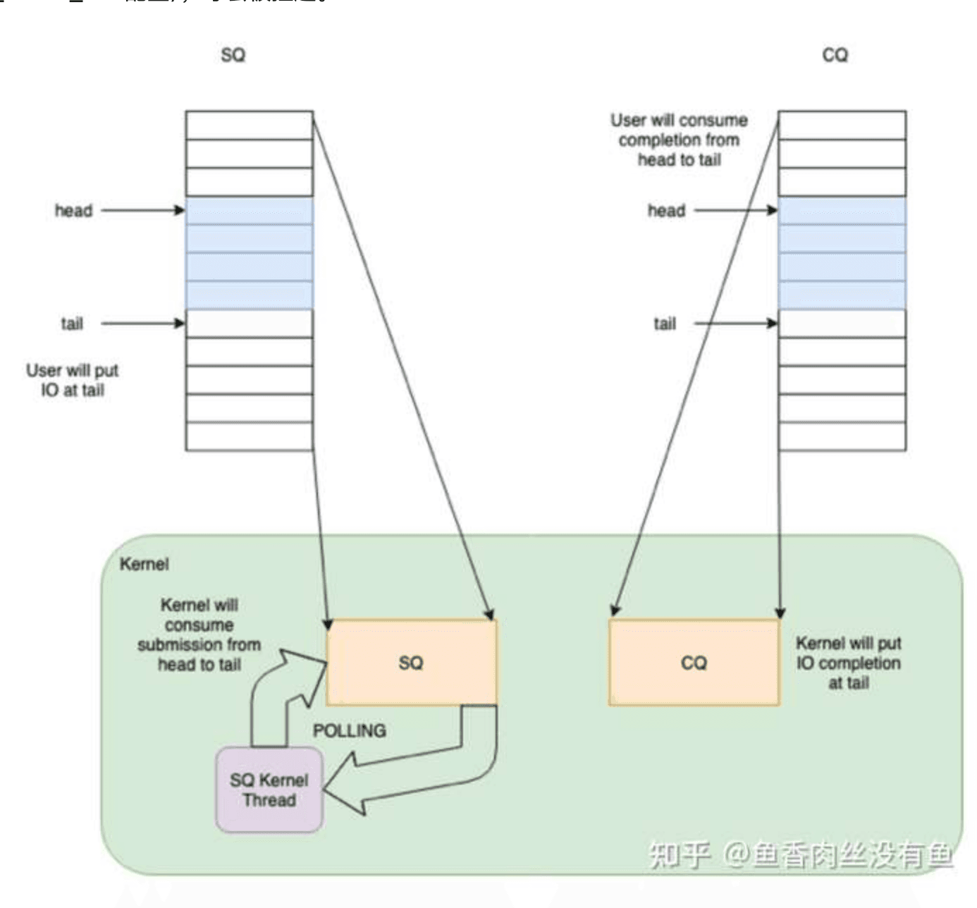 linux 5.1 内核引入的新异步 IO api。有 SQ(Submission Queue)和 CQ(Completion Queue)两个队列,用户程序可以通过 mmap 将此数据结构映射到用户程序空间。当用户提交 I / O 任务时(io_uring_submit),可以减少切换到内核态到次数。简单来说,在轮询模式下,当用户线程修改 SQ,提交了新 IO 任务,如果 SQ 内核线程是活跃的,那么就可以立即获取到该提交并进行处理,此时可以避免系统调用,如果 SQ 非活跃,则进行相应的系统调用,通知内核新的 I / O 任务到达。