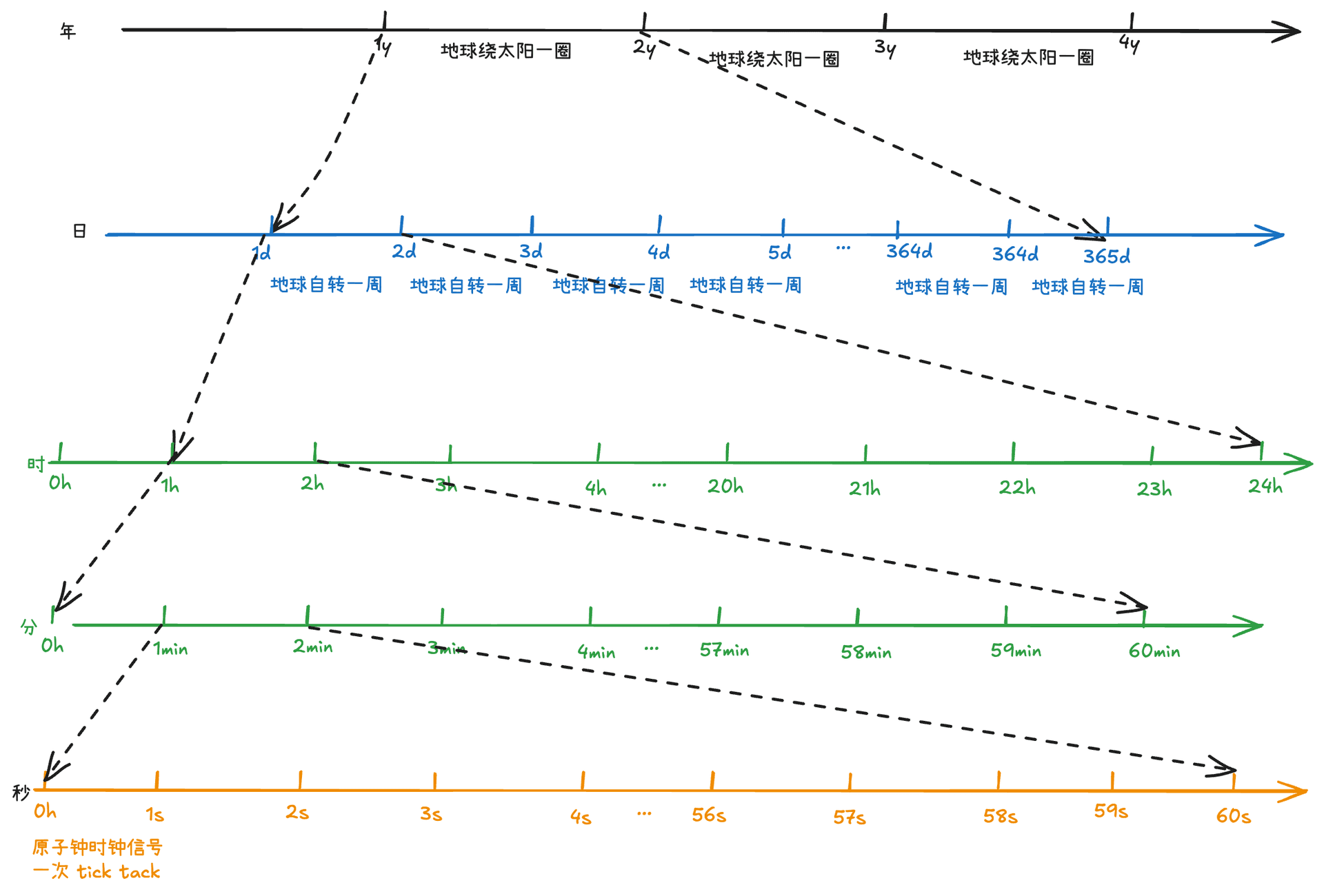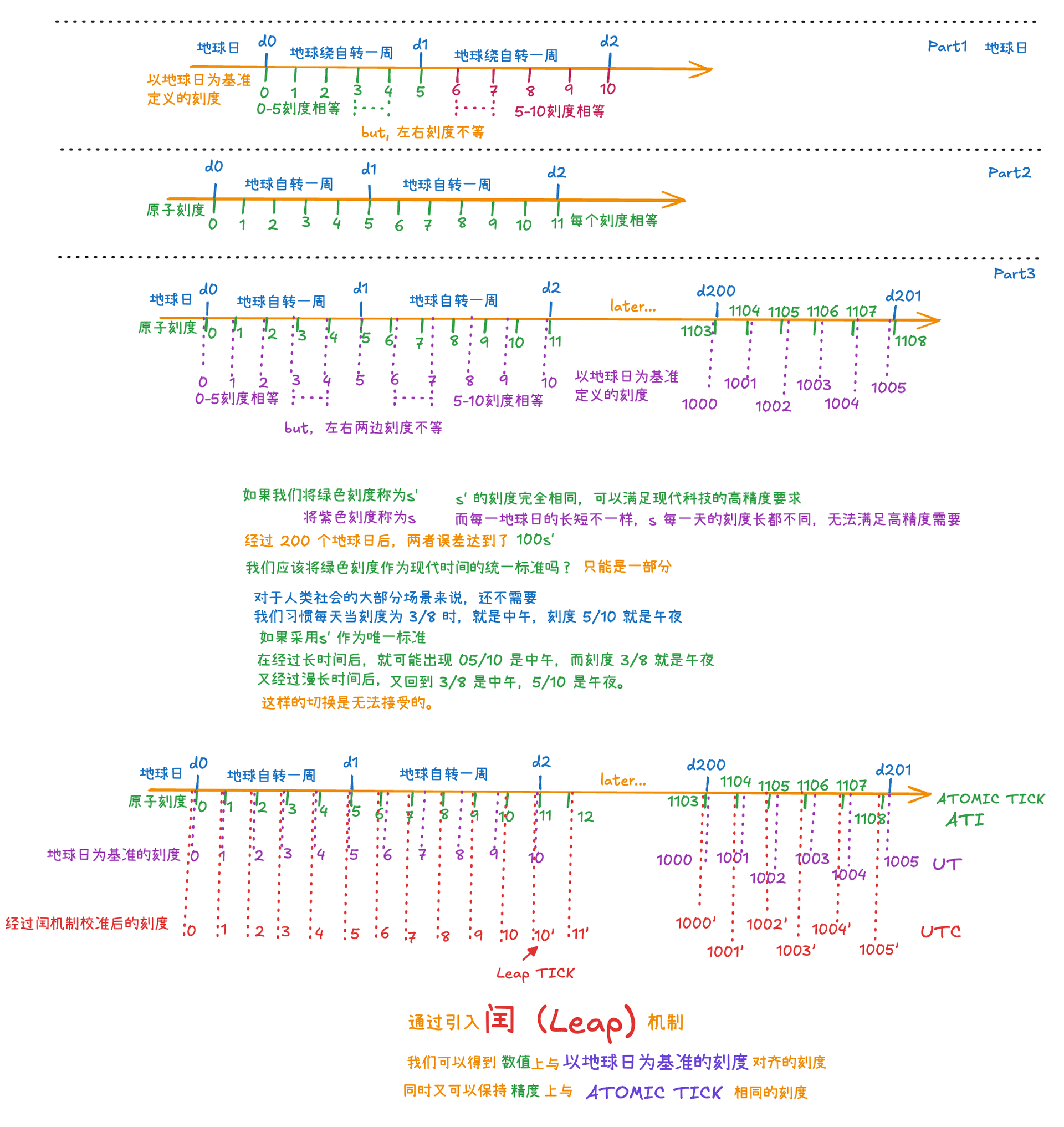 随后对传统的年月日进行确定,地球自转一周是 1 日 = 24 * 3600 秒 (理想情况),但是地球自转相对原子钟并不那么稳定,有时有误差,因此引入闰秒机制、适时地为日的进度 + 1,-1 秒。这就是 UTC(协调世界时),通过 UTC 来表示一个全球通用的标准时间。