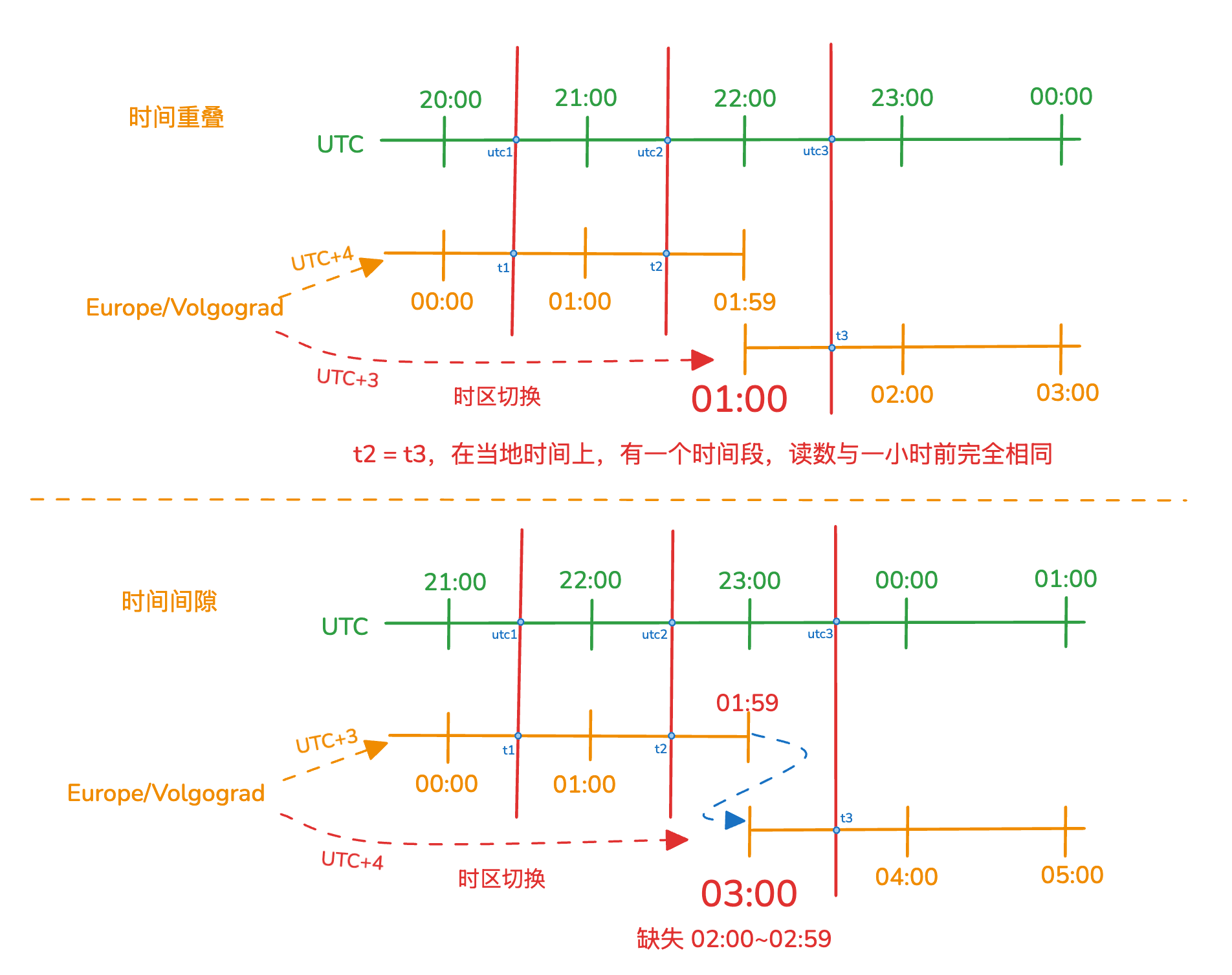 下图演示了当时区切换造成本地时间读数的时间重叠和时间间隙。